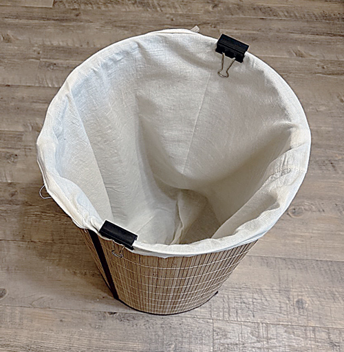 Мой лайфхак достаточно прост. У бельевой корзины есть внутренний вкладыш, который, даже будучи завязан по кругу, постоянно проваливается внутрь из-за тяжести белья. Чтобы этого не происходило, можно использовать большие канцелярские зажимы для бумаги соответствующего размера, которые прочно фиксируют вкладыш.