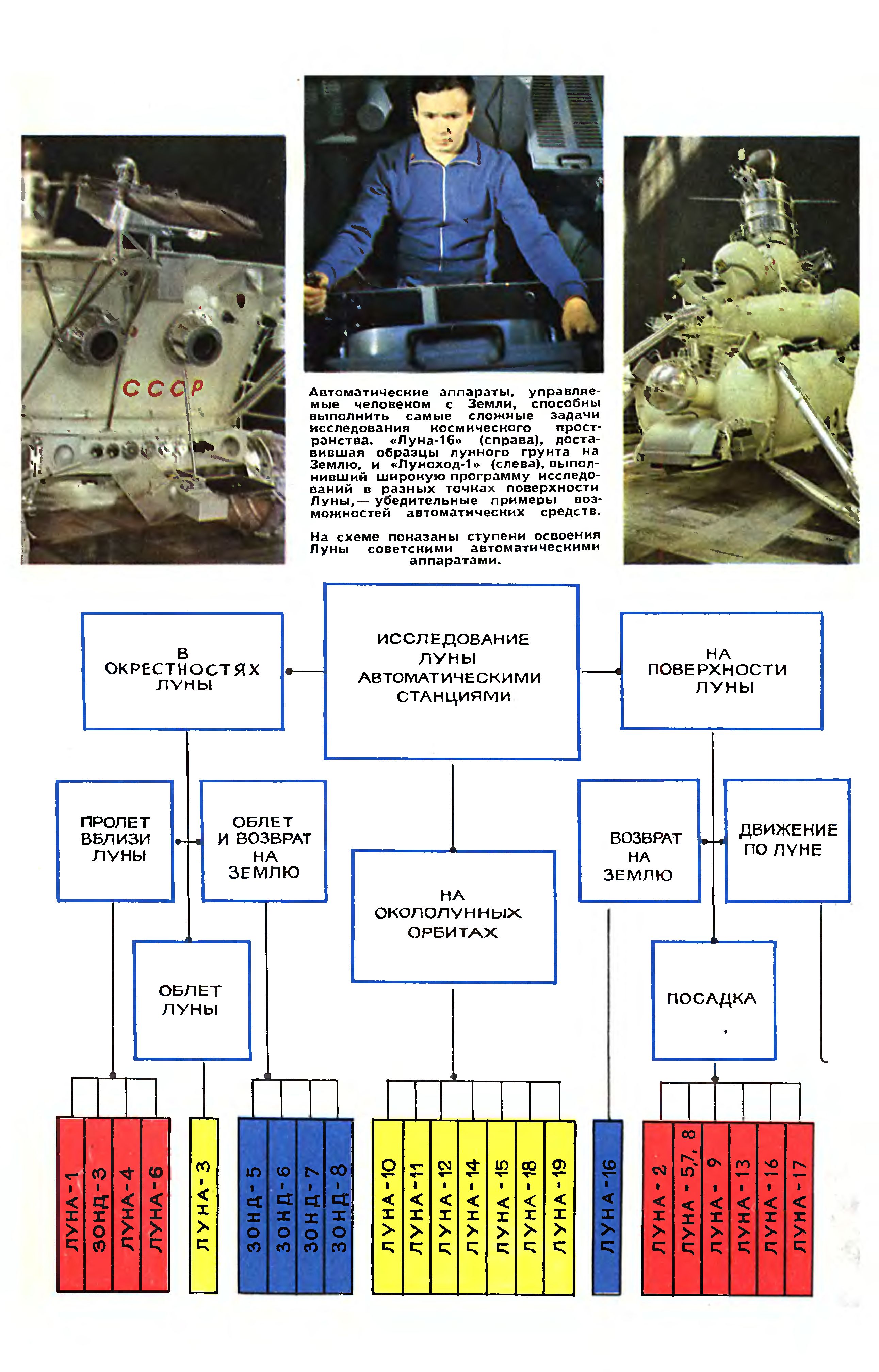 В каждом последующем запуске усложняется комплекс научных, и технических задач, меняющихся в соответствии с накопленными сведениями, и новыми целями полета. Особенно ясно это проявилось при запусках станций серии «Луна». Доставка автоматом образцов лунного грунта, комплекс научных исследований, которые провела подвижная лаборатория «Луноход-1», - великолепная иллюстрация возможностей автоматических средств.
