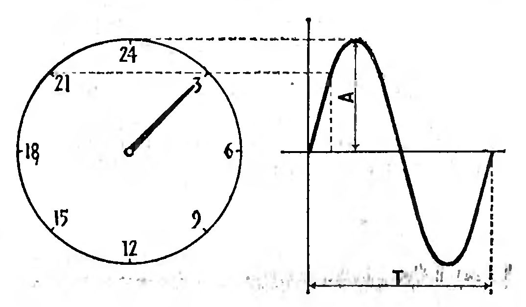 Четкая ритмичность почти всех физиологических процессов говорит о том, что это - одно из основных свойств живой природы. Какие механизмы гарантируют сохранение такой ритмики и после того, как исключается действие внешних синхронизаторов? Ответив на этот вопрос, мы ответим, и на следующий, каким образом живой организм измеряет время? Ведь каждая точка отклонения любого физиологического процесса от среднего значения не, что иное, как определенное состояние клеток, и тканей. Это состояние становится мотивом, толчком того или другого поведенческого акта, а тем самым, и стрелкой времени (см. рис. на стр. 38).