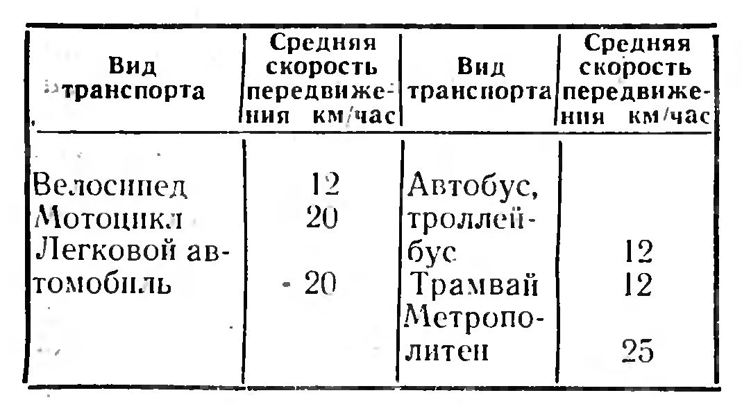 Должен сказать, что по скорости передвижения этот вид транспорта, особенно в часы пик, мало уступает другому (посмотрите таблицу). Эти данные получены Академией строительства ГДР. Аналогичные исследования в Москве провел инженер Б. Д. Меркулов.