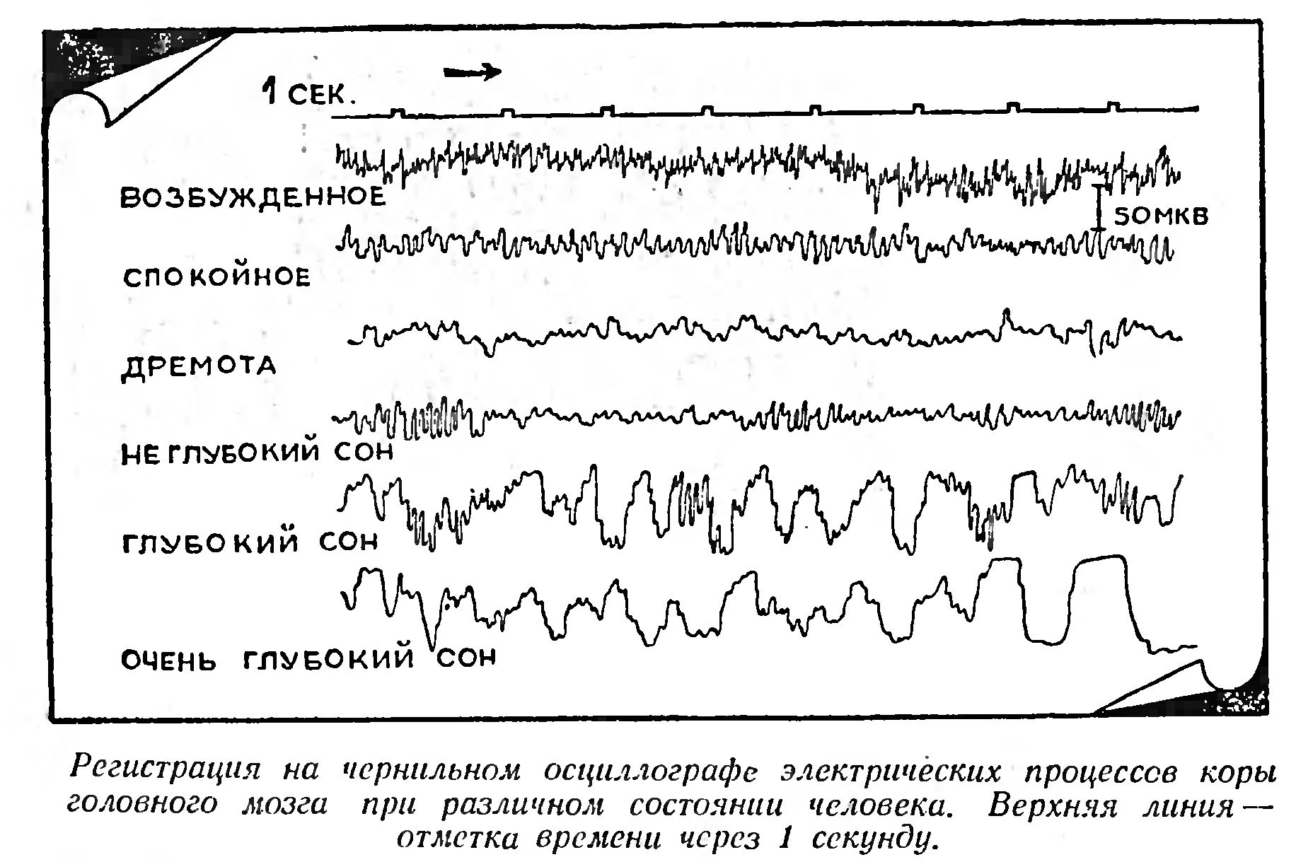 Кора головного мозга непрерывно, днем и ночью генерирует (возбуждает) электрические волны, которые в известной степени отображают его функциональное состояние. Если мозг человека здоров, волны имеют примерно от 8 до 13 колебаний в секунду с наложенным на них более частым ритмом (около 25 в секунду). Болезненное состояние коры головного мозга влечет за собой и изменения частоты колебаний. Эпилептический припадок сопровождается медленными, имеющими характерную форму волнами. В коре мозга происходят, как бы «электрические бури», при этом волны достигают огромной величины и в десятки раз превосходят обычную амплитуду своих колебаний. По мере прекращения болезненного состояния «электрическая буря» успокаивается, амплитуда воли уменьшается, частоты их приходят к норме. В тех случаях, когда заболеванием поражен, какой-либо отдельный участок мозга, картина, которую дает нам электроэнцефалограмма этого участка, значительно отличается от наблюдаемой на здоровых участках. Иногда можно видеть, как болезненный фокус передвигается по коре головного мозга.