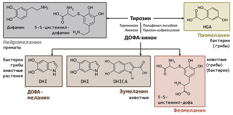 Чтобы разобраться в различиях между типами меланина, полезно рассмотреть их химические структуры. Синтез любого вещества начинается с субстрата. В случае меланина главным субстратом у многих организмов выступает аминокислота L-тирозин. Из неё в два этапа фермент тирозиназа, или его аналоги, в зависимо-сти от организма, образует ДОФА-хинон*. Он очень реакционноспособен, поэтому легко преобразуется в основной предшественник меланина — 5,6-дигидро-ксииндол (DHI). Такой путь синтеза могут использовать животные, бактерии, грибы и растения. Модифицируя отдельные этапы синтеза, организмы научились производить разные типы меланина.