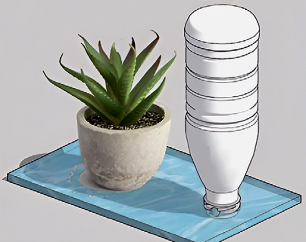 Предлагаю описание простого приспособления для автоматического полива рассады и домашних растений в отсутствие хозяев в доме. Просверлите в крышке пластиковой бутылки из-под молока отверстие диаметром не менее 9 мм. Наполненную водой бутылку заверните крышкой, переверните вверх дном и установите в поддон с находящимся в нём цветком. Уровень воды в поддоне будет поддерживаться на минимальном по мере потребления воды растением.