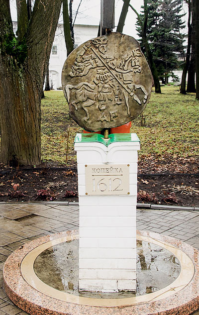бражённым на ней всадником с копьём. Одни исследователи считают, что это Георгий Победоносец, поражающий копьём змия, другие полагают, что на коне великий князь Иван III, поскольку на голове у всадника корона — символ царской власти.