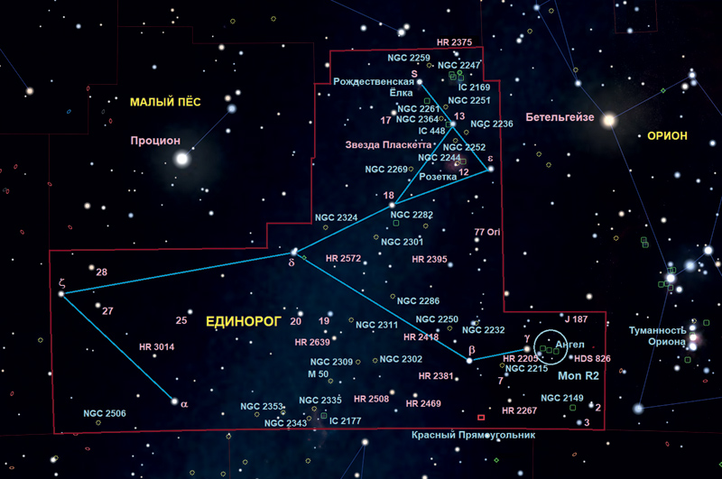 Созвездие Единорог. Показаны звёзды с блеском до 6,5m, звёздные скопления и туманности до 14m. Имена указаны для звёзд до 5,5m, прочих объектов — до 11m.