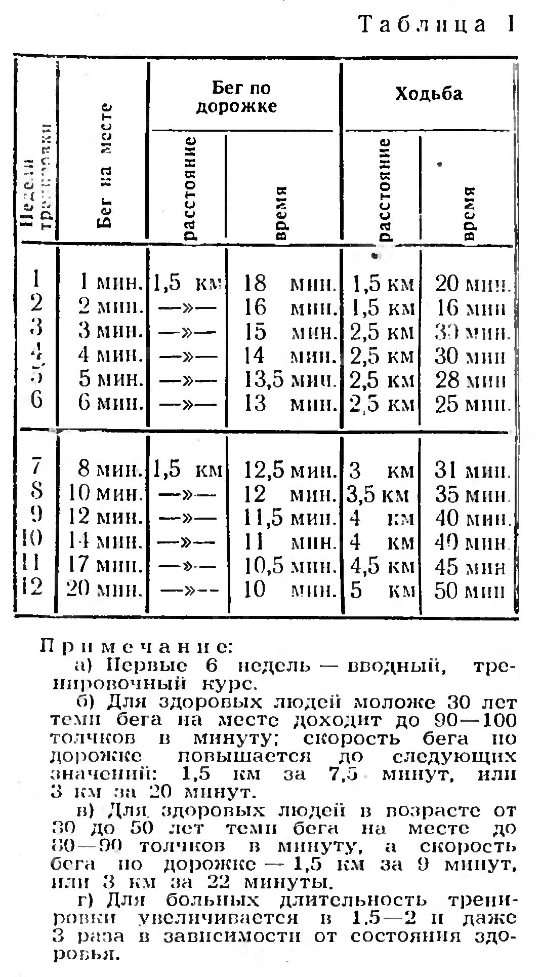 Вторая заповедь режима - физическая нагрузка. Природе человека противны бесполезные усилия. Поэтому лучше всего искать пути для целесообразного применения своих сил. Есть, например, такая полезная возможность, как ходить пешком на службу. Если вы молоды и здоровы, перестаньте пользоваться лифтом. Если нет возможности выполнять, какую-то конкретную полезную физическую работу, надо прибегнуть к физкультуре. Специалисты определили минимально необходимый уровень физической нагрузки для человека. Как пример укажу на систему «Аэробик», разработанную американским ученым Куплером, и широко распространенную в США и Канаде. (Его данные использованы при построении -таблицы минимально необходимых нагрузок, и времени тренировки - см. табл. 1.)