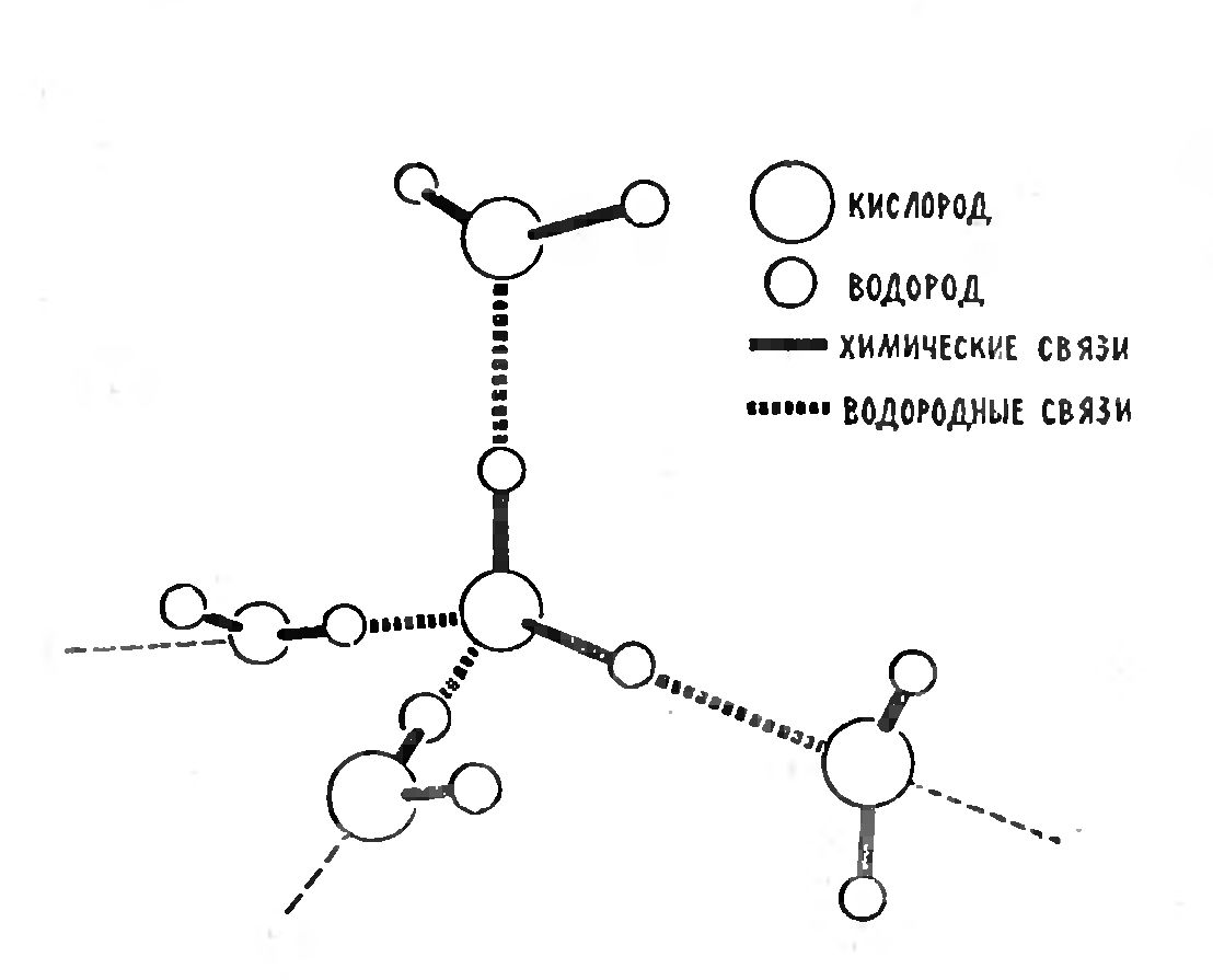 Как лед, так, и вода отличаются от других жидкостей рыхлостью своей структуры, которая к тому же резко меняется с температурой. Этим, и объясняются аномалии обычной воды. В свою очередь, рыхлость структуры льда, и воды обусловлена действием так называемой «водородной связи». Атом водорода, как мост, скрепляет два кислородных атома, принадлежащих двум разным молекулам воды. При этом энергия, которая осуществляет эту связь, промежуточна между энергией обычной химической связи (действующей, например, между атомами О, и Н в одной, и той же молекуле воды), и энергией молекулярного притяжения соседних молекул. Атом кислорода, входящий в состав каждой молекулы воды, способен соединяться водородными мостиками с четырьмя другими атомами кислорода. Связь осуществляется четырьмя атомами водорода; два из них входят в химический состав рассматриваемой молекулы, а два других принадлежат двум другим молекулам. Таким образом, вокруг молекул воды в пространстве расположены четыре водородных мостика (рис. 1). В наиболее чистом, и полном виде подобная система водородных мостиков образуется в кристалле обыкновенного льда. В нем каждая молекула объединена водородной связью точно с четырьмя ближайшими соседями. В целом кристалл представляет собой каркасное сооружение, образованное «сеткой» водородных связей со множеством пустот между ними. Именно при таком строении возникает та самая ажурная структура льда, которая объясняет ряд его свойств, в частности способность плавать на воде. Учитывая квазихимический (то есть, как бы химический) характер водородной связи, про кристалл льда можно сказать, что он представляет собой одну полимерную молекулу, в которой кислород «как бы» четырехвалентен. При плавлении льда идеальная правильность расположения молекул воды, и строения сетки водородных связей нарушается. Чем выше подымается температура, тем все большее число водородных мостиков разрушается под действием теплового движения, и молекулы занимают все более плотную упаковку. Пустоты в структуре воды уменьшаются. Поэтому вода сжимается, несмотря на то, что тепловое движение одновременно стремится увеличить среднее расстояние между молекулами. Только выше +4О Ц последняя тенденция берет верх, и вода начинает расширяться.