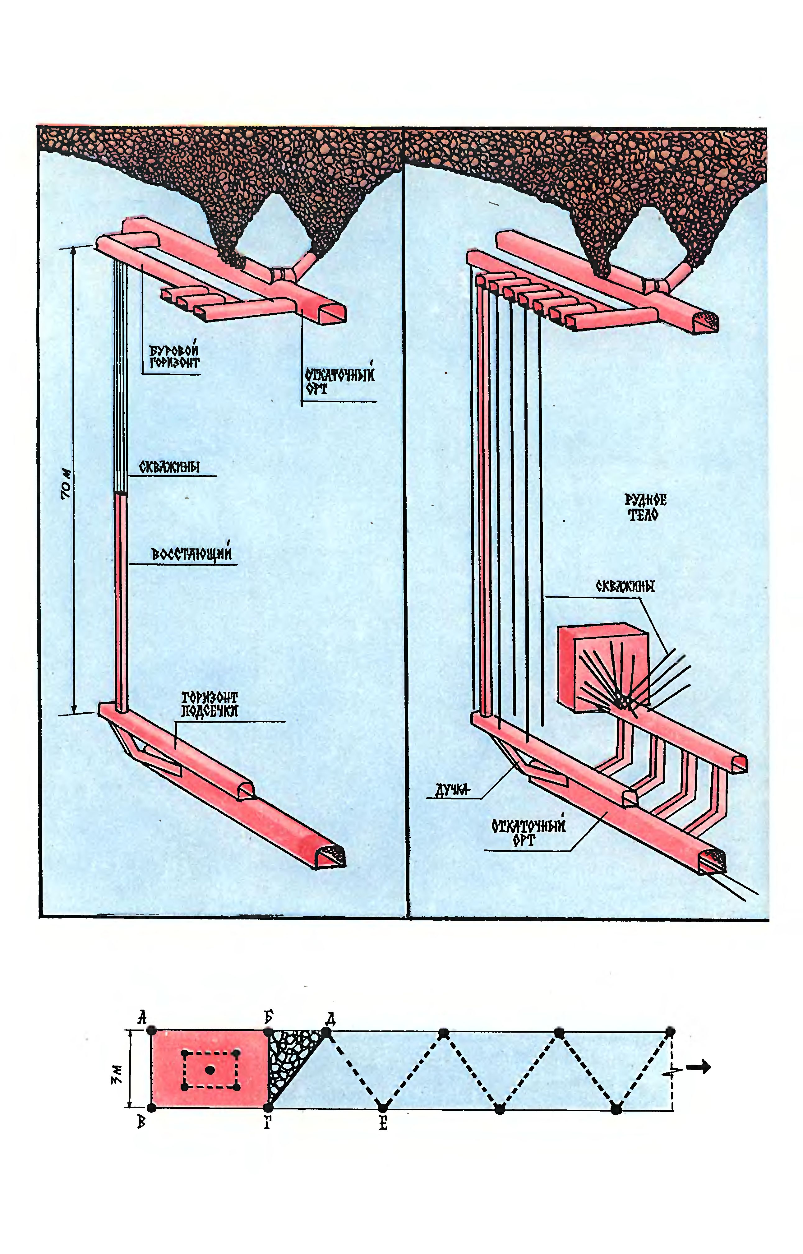 Метод добычи руды, описанный здесь, идет на смену старому. Представление о нем дает нижняя схема. Уже из рисунка видны его недостатки здесь больше вспомогательных ходов; работы не сконцентрированы; руда выбирается сначала из небольших, разрозненных блоков, между которыми остается нетронутая порода - целик; руду не удается дробить на куски нужных размеров и более чем наполовину приходится измельчать вторично; ее доставка в откаточный орт затруднена - здесь особенно высок травматизм. Эти, и другие недостатки традиционного метода не могут быть устранены, как его ни рационализируй.