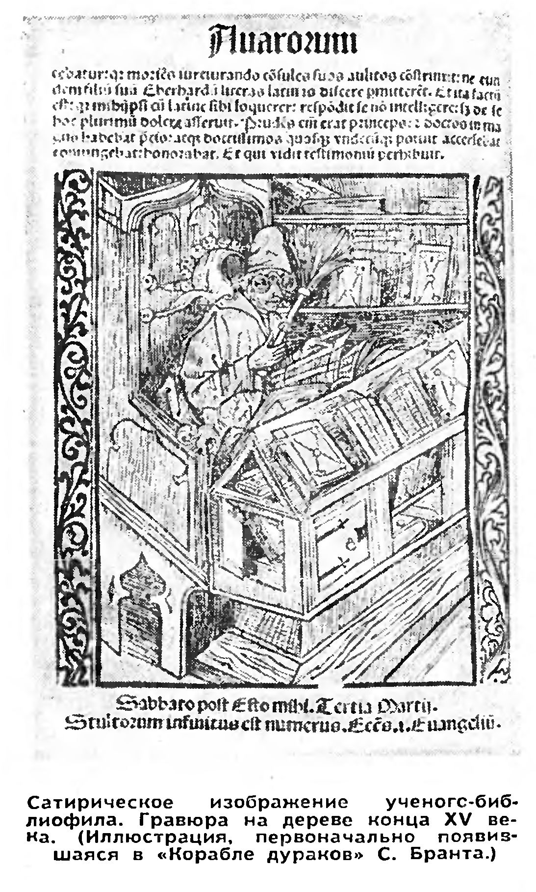 Так изображал атрибуты ученого молодой Маяковский в своем сатирическом «Гимне ученому» (1915). Каждый согласится, однако, что подобные предметы приличествуют скорее алхимической лаборатории XVI века, чем кабинету ученого нового времени. Портретисты, и театральные постановщики обычно изображают ученого в окружении книг, на фоне его библиотеки. И они глубоко правы, поступая таким образом. Библиотека, независимо от специальности ученого, является его лабораторией. В ней он черпает необходимые для работы сведения, в ней встречает суждения, которые либо подтверждают правильность хода его мысли, либо, что не менее важно, вызывают потребность возражать, спорить, и бороться. Библиотека позволяет также преодолевать односторонность ученого, почти неизбежно вызываемую углубленным изучением избранной темы, она, как бы стократно расширяет вместимость его разума, становится прямым продолжением его физического, и духовного существа.
