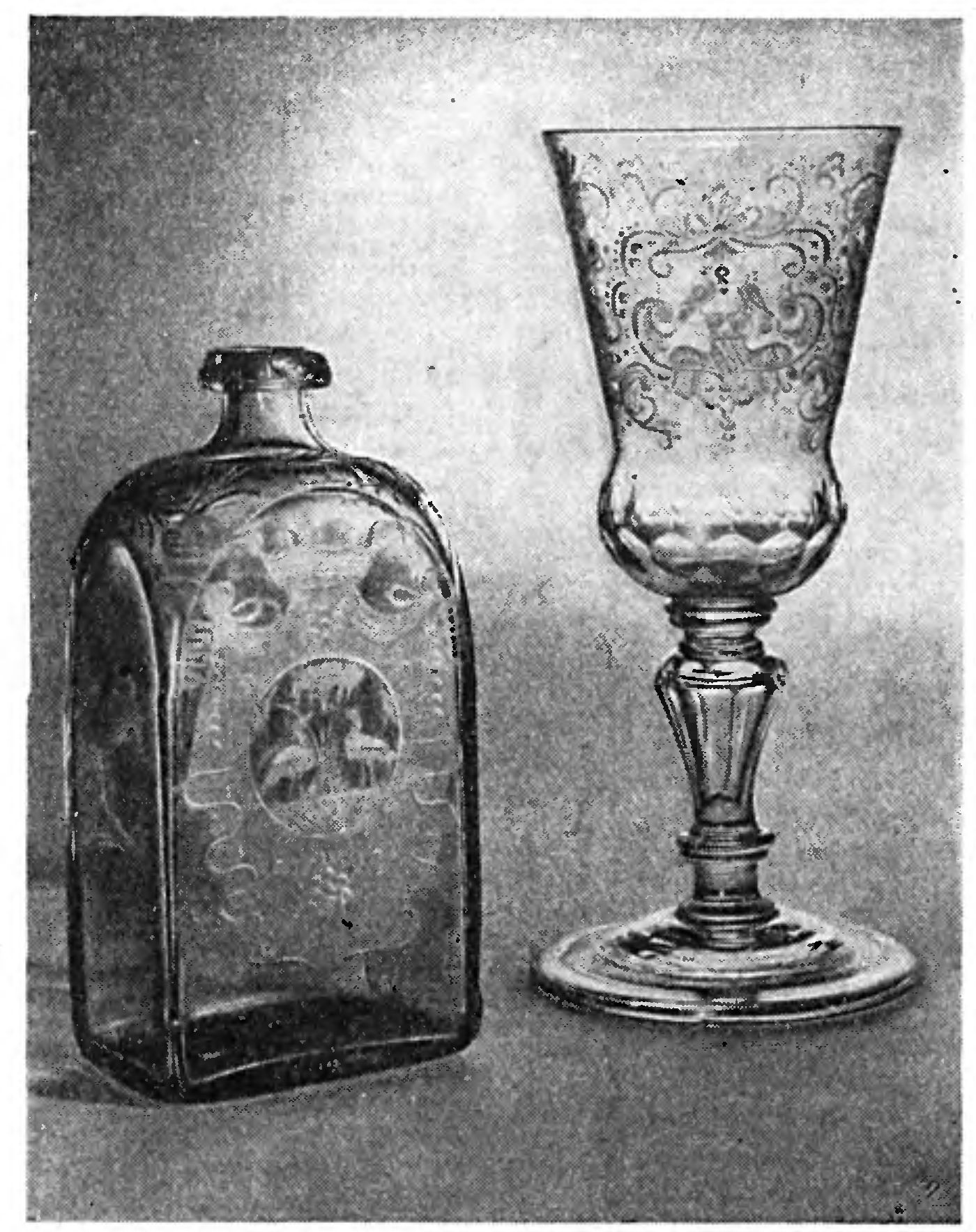 Так выясняется, что мальцевские заводы в течение всего XVIII столетия производили не только бытовую посуду, но, и высокохудожественные изделия со сложным гравированным орнаментом. Здесь нет экзотических цветов излюбленным мотивом была травка, и цветы ромашки. Не без основания можно полагать, что в мальцевских изделиях с наибольшей отчетливостью выразился национальный стиль русского художественного стекла.