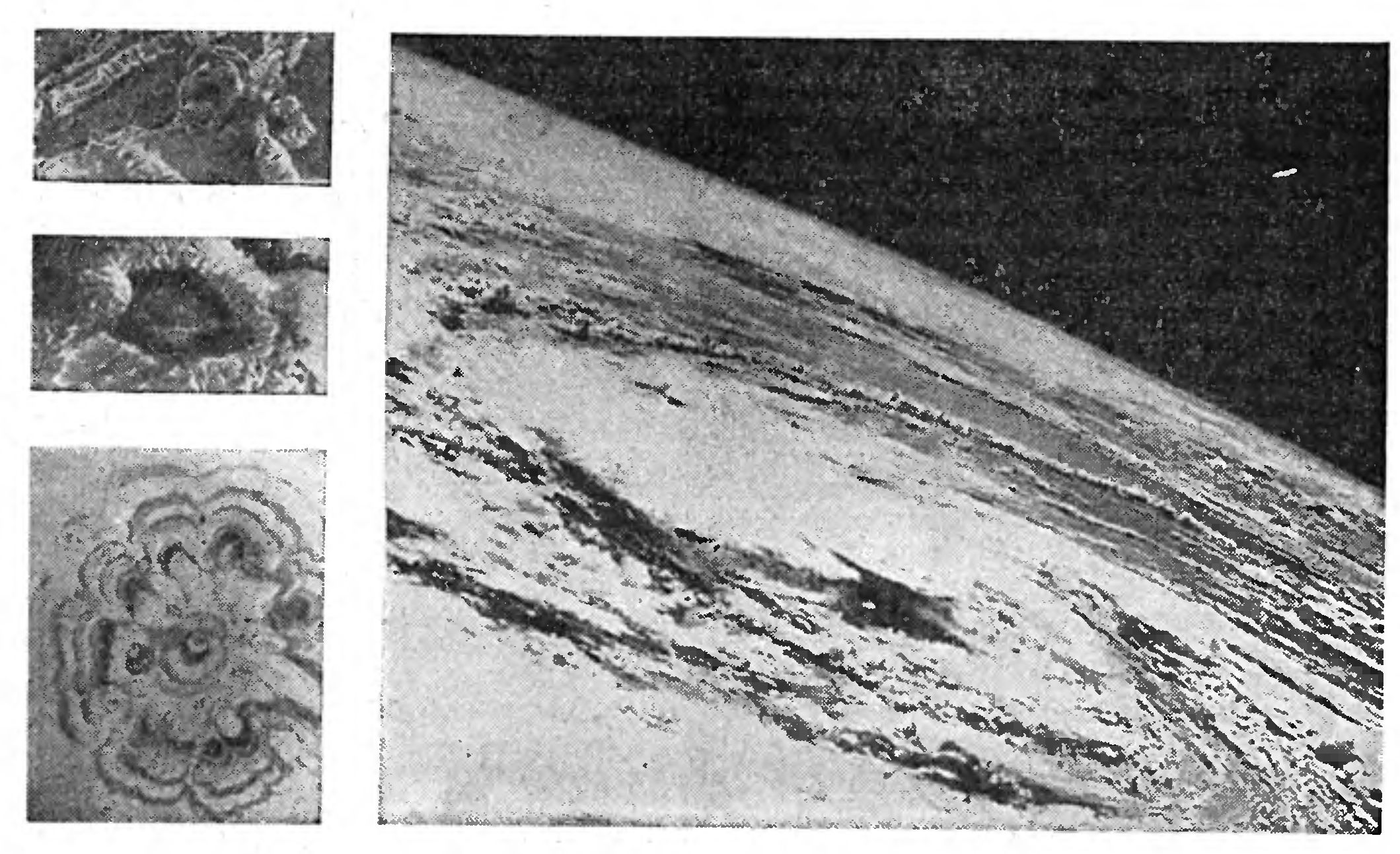 Наконец, правое фото переносит нас в область макроразмеров. Эта фотография сделана с искусственного спутника Земли. На ней изображено спиральное завихрение циклона, который привел к сильнейшему урагану 17 октября 1968 года в штате Флорида (США). Исследовать структуру атмосферы, определять анизотропию воздушных потоков, изучать перемещения воды, вычислять величину, и процентное соотношение областей с различным по возрасту складчатым основанием поверхности Земли по аэрофотоснимкам и решать множество других «глобальных» проблем можно с помощью все той же стереологии, которая так удобна при изучении микрообъектов. Разница размеров в 1016 разве помеха? Методы изучения остаются общими.