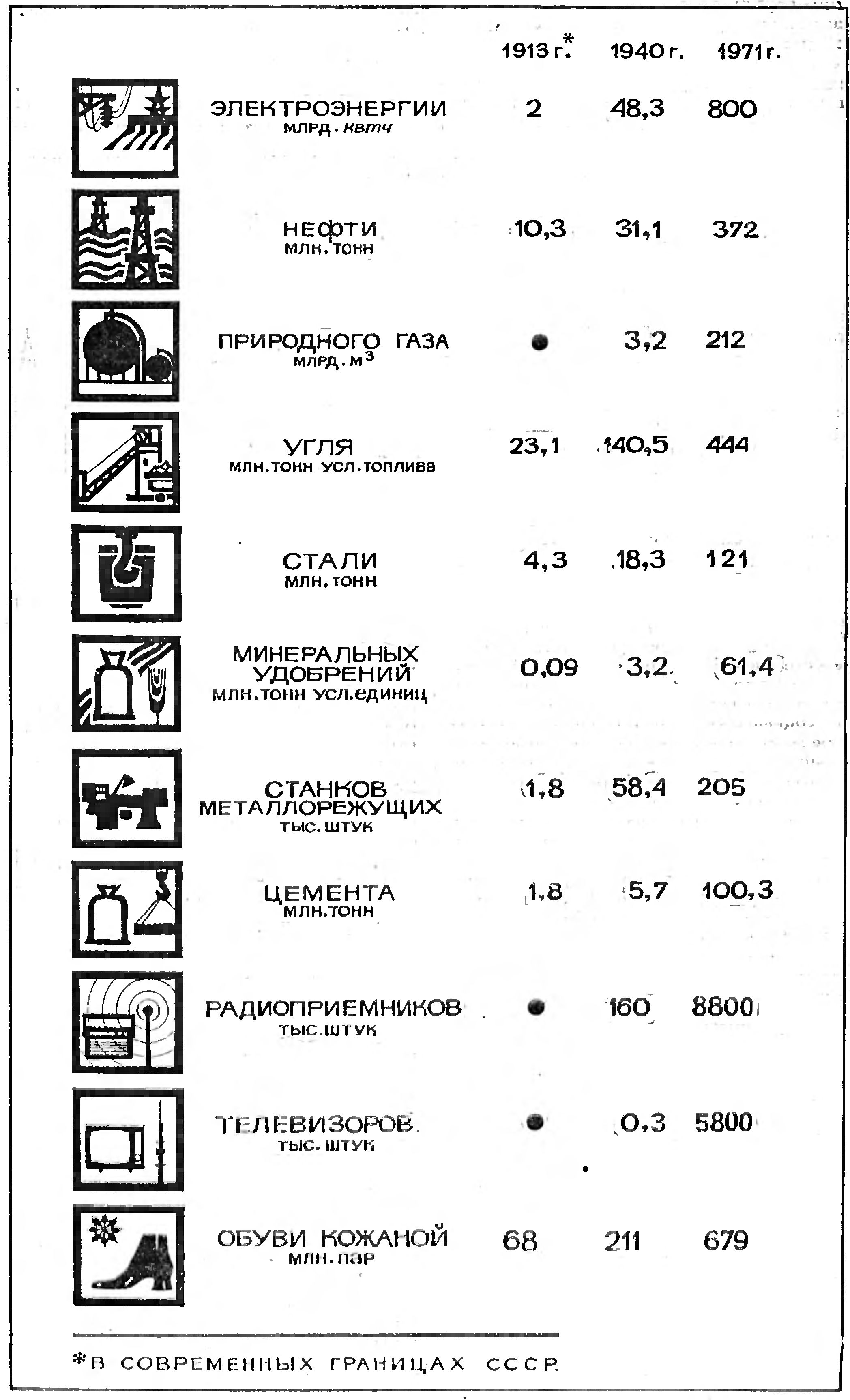 В таблице (стр. 19) приведены показатели роста производства некоторых основных видов промышленной продукции в СССР (по сравнению с дореволюционным уровнем).