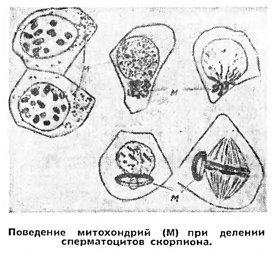 Поведение митохондрий (М) при делении сперматоцитов скорпиона.