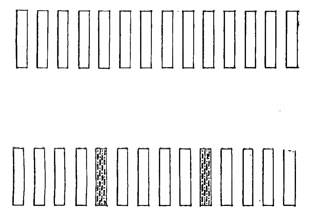 Описанная Эббингаузом закономерность запоминания ряда из однотипных элементов не распространяется на следующий ряд из десяти флажков (см. рис. внизу).