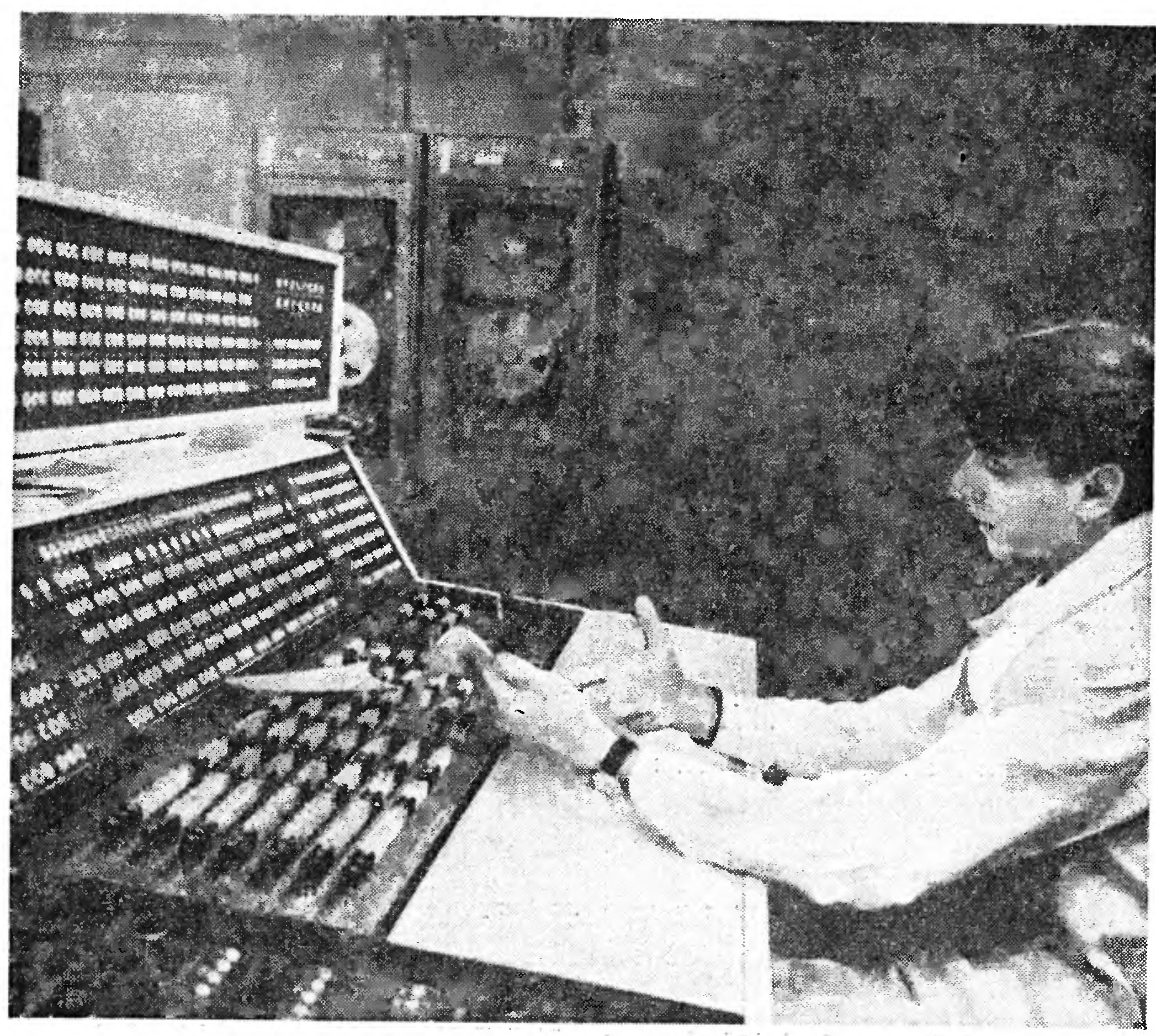 На снимке (слева) инженер В. Г. Ворошилов за пультом управления.