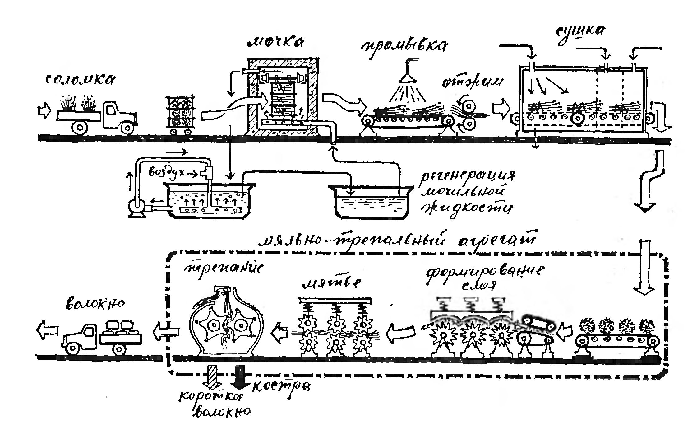 В новой технологической схеме заложены два принципа химическое, а не бактериальное разложение пектиновых клеев и непрерывность всех процессов. Правда, химическое разрушение более грубое, чем бактериальное, при этом могут ненароком расщепиться не только клеи, связывающие волокна, и древесину, но и вещества, соединяющие короткие волоконца в длинные волокна, а это уже явление нежелательное. Поэтому ученые построили процесс таким образом, что после каждого химического воздействия льносолому отжимают на вальцах, и промывают; примеси при этом удаляются и разрушение приостанавливается.
