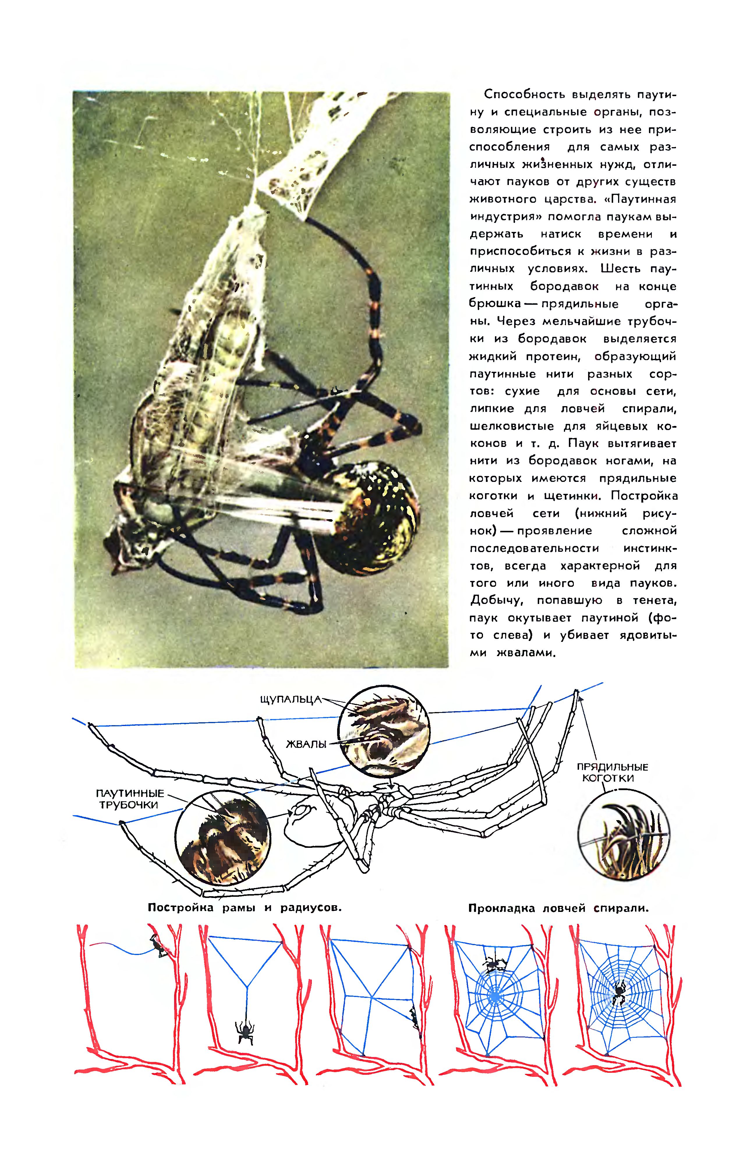 Во время моего познания мира пауков меня больше всего увлекали пауки, плетущие ловчие сети. Материал для их воздушных, тончайших созданий - сложный комплекс белков - производится специальными железами, расположенными в брюшной полости паука, причем каждый из типов желез производит особую разновидность паутинного шелка. Действуя отдельно или комбинированно, эти железы «поставляют» сухие или вязко-липкие нити для радиусов, соединений, и крепящих узлов паутины, для кокона, в котором хранятся яйца, для лент, которыми окутывается добыча. Пряди паучьего шелка необычайно эластичны, и прочны некоторые из них могут растягиваться более чем на 20% своей длины; они крепче, чем стальная проволока того же диаметра! Но, несмотря на всю свою красоту, сверкающая поутру капельками росы паутина - жестокое изобретение природы. Крупные, тяжелые насекомые, такие, как пчелы или осы, попав ненароком в ловушку, способны порвать паутину. Но для более легкой добычи эта почти невидимая сеть означает смерть. Чувствительные рецепторы паука воспринимают малейший импульс от насекомого, попавшего в паутину, и паук бежит, едва касаясь сети, чтобы парализовать жертву одним укусом, и связать ее шелковой нитью. Из тела беспомощного насекомого будут высосаны питательные соки, а остатки либо выброшены, либо оставлены висеть в напоминающей мумию оболочке для будущей трапезы.