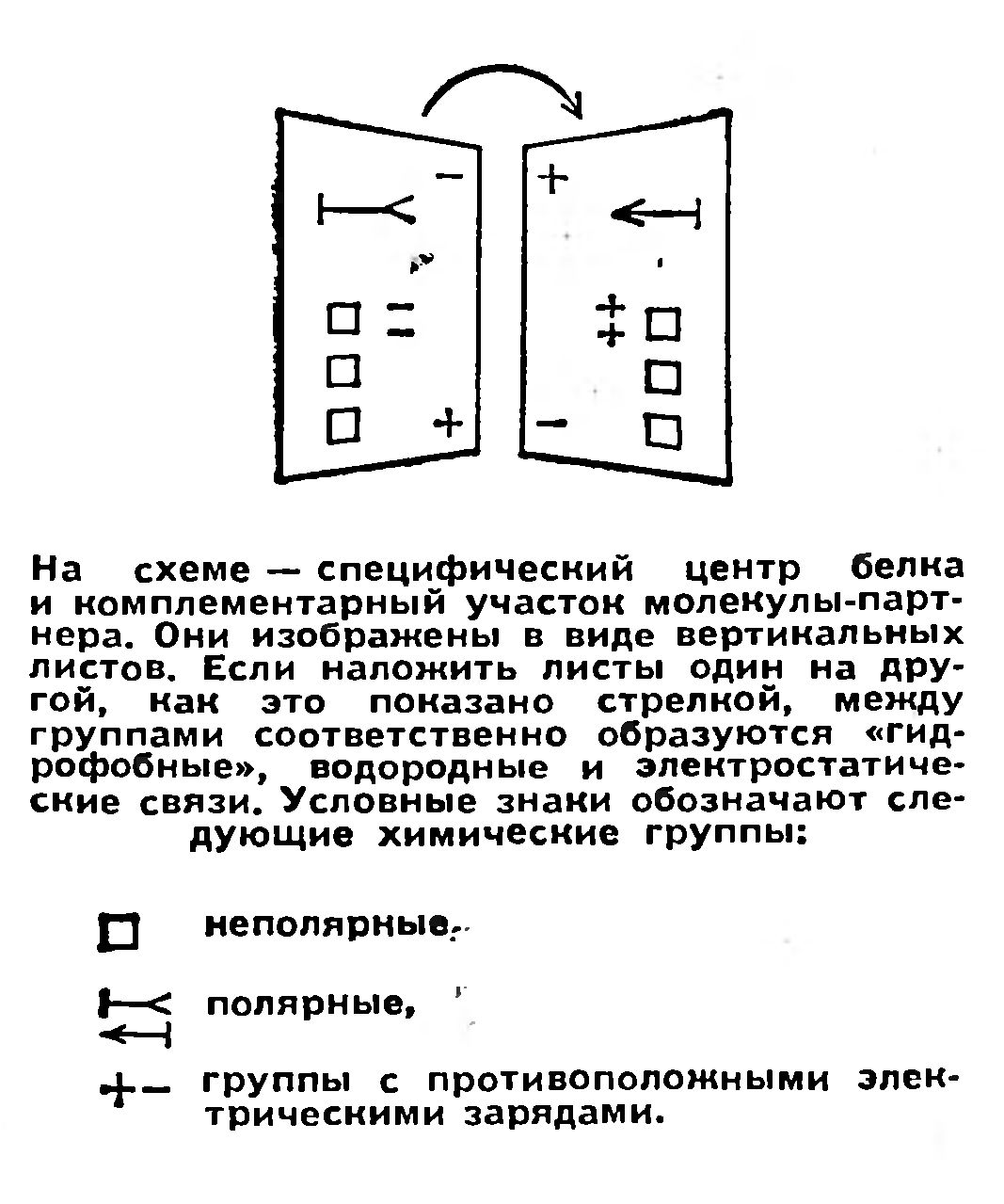 Упомянутая выше избирательность действия специфических центров достигается за счет соответствия в составе, и размещении химических групп в самом центре и в молекуле-партнере - так называемой комплементарное™. Любая замена или перемещение групп означает нарушение комплементарное™. Так же ясно, и то, что специфический центр - не только рабочий механизм, но и шифр, позволяющий белковой молекуле «узнавать» своего партнера среди множества других, даже имеющих с этим партнером большое сходство, молекул.