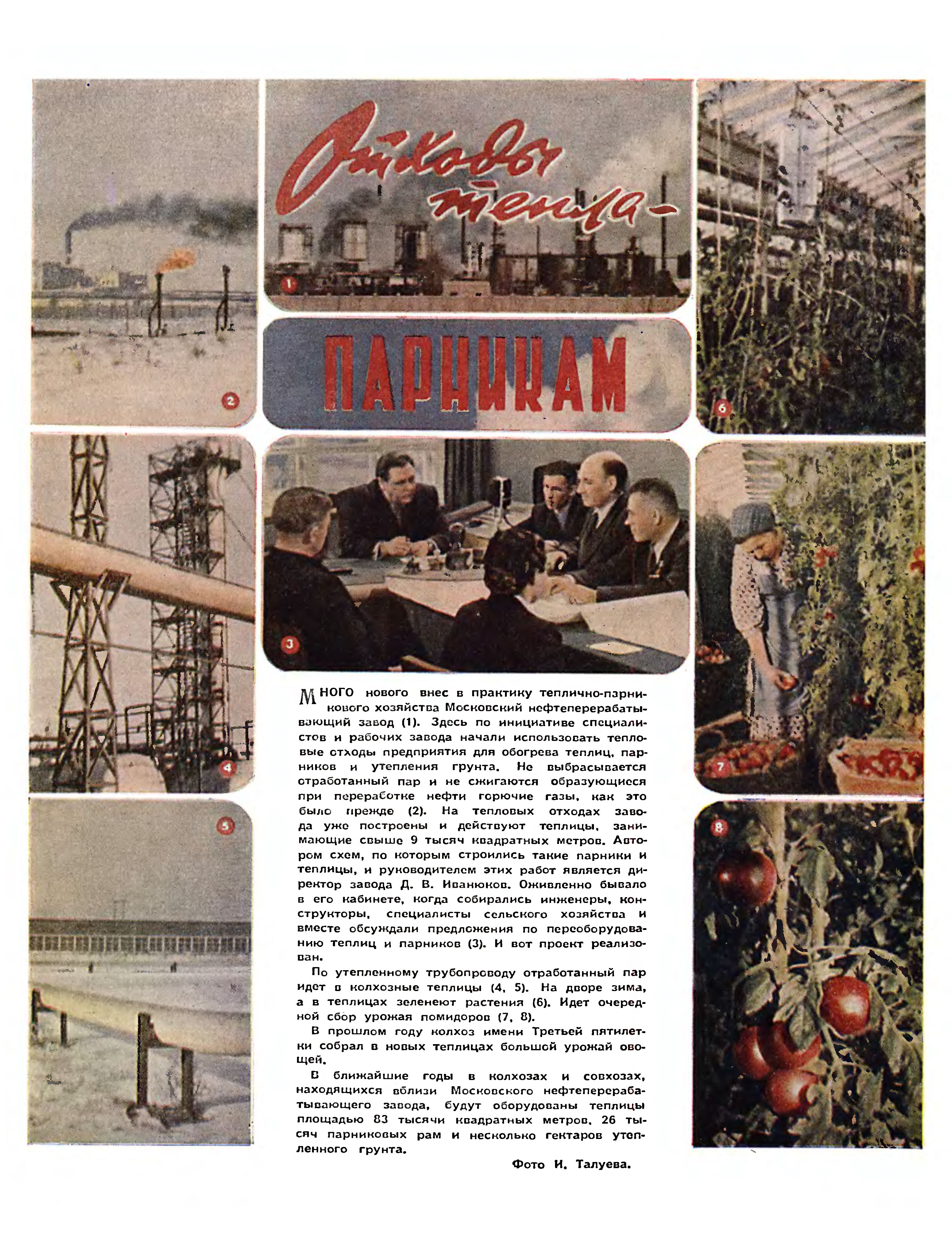 МНОГО нового внес в практику теплично-парникового хозяйства Московский нефтеперерабатывающий завод (1). Здесь по инициативе специалистов и рабочих завода начали использовать тепловые отходы предприятия для обогрева теплиц, парников и утепления грунта. Не выбрасывается отработанный пар и не сжигаются образующиеся при переработке нефти горючие газы, как это было прежде (2). На тепловых отходах завода уже построены и действуют теплицы, занимающие свыше 9 тысяч квадратных метров. Автором схем, по которым строились такие парники и теплицы, и руководителем этих работ является директор завода Д. В. Иванюков. Оживленно бывало в его кабинете, когда собирались инженеры, конструкторы, специалисты сельского хозяйства и вместе обсуждали предложения по переоборудованию теплиц и парников (3). И вот проект реализован.