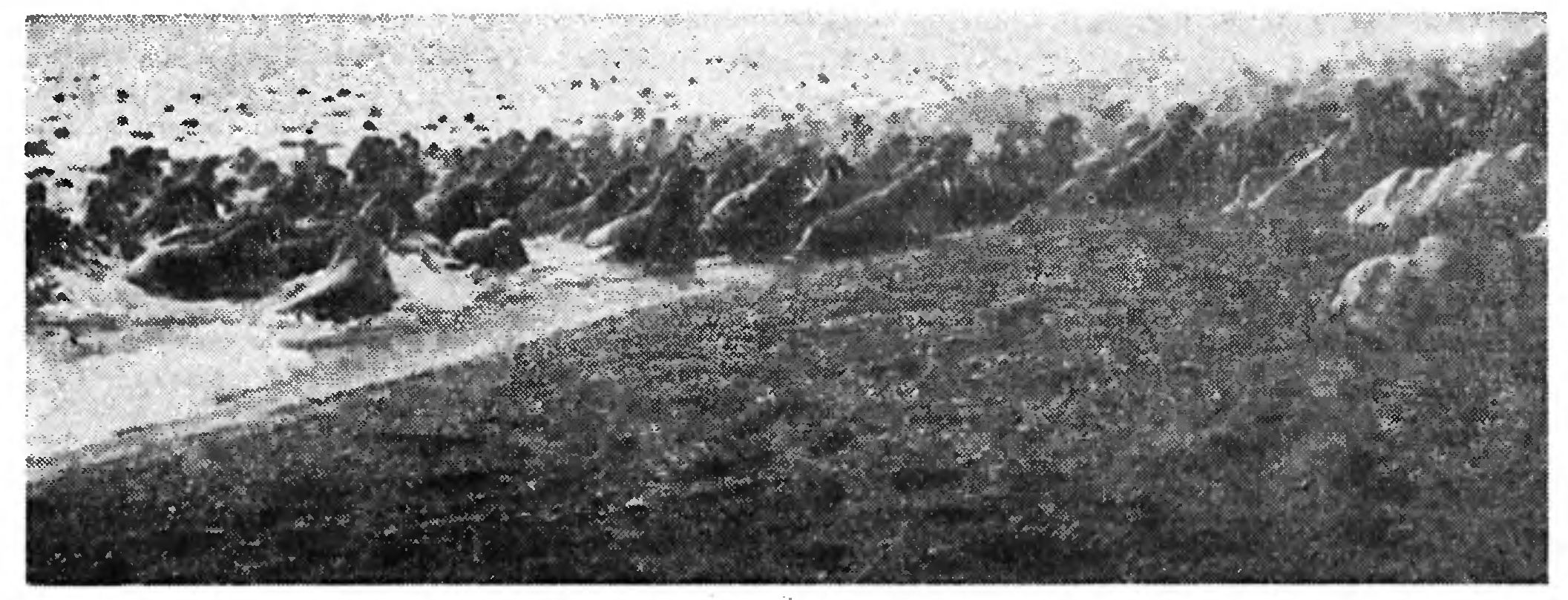 Наконец, полуторатонный самец, шея и грудь которого, как орденами, украшена розовыми шишками - следами схваток, подхваченный океанской волной, оперся ластами о прибрежную гальку. И сразу многотысячное стадо с ревом двинулось на зовущую твердь. Звери выходят, падают, и тут же засыпают, убаюканные морем. Задние напирают, подбадривают клыками, приходится вставать и ползти дальше, неуклюже опираясь на живот. А моржи все подходят, и подходят - все море вплоть до горизонта покрыто их головами.