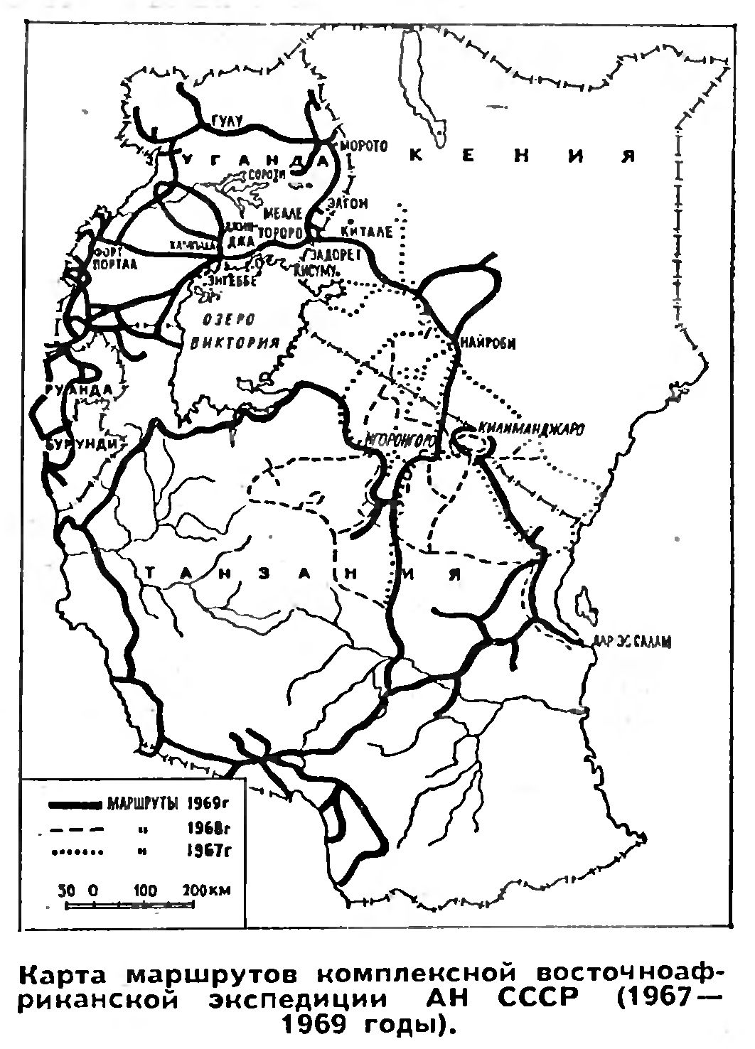 В 1969 году, третьем и заключительном году экспедиции, нам предстояло работать на всем протяжении Западной рифтовой долины. В Восточной Африке она начинается на севере Уганды, и тянется вдоль долины Альберт-Нила (так здесь называется Белый Нил), через впадину озер Альберт, Эдуард, Киву, Танганьика и Ньяса. Это огромное тектоническое сооружение протяженностью более 2 тысяч километров пересекает территории семи государств (Уганда, Конго, Руанда, Бурунди, Танзания, Замбия, и Малави). По опыту предыдущих лет мы решили разбиться на два отряда северный - для работы в Уганде, Руанде и Бурунди, и южный - для работы в Танзании. Обследование всей гигантской территории предстояло провести за три месяца.
