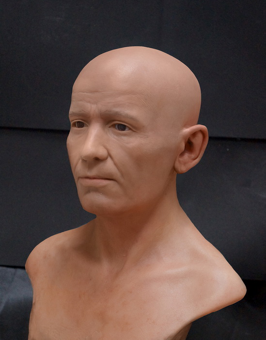 Эта мастер-модель была нужна для изготовления разъёмной формы (матрицы), которая позволила бы получить точную негативную копию лица и головы. В разъёмную форму заливали специальный двухкомпонентный силикон, подобранный по твёрдости и эластичности для лучшей имитации мягких тканей. После полимеризации отливку подвергли финальной художественной обработке: глаза заменили реалистичными протезами глазных яблок, проработали ресницы и брови, «коже» придали реалистичный тон послойной прокраской полупрозрачными пигментами.