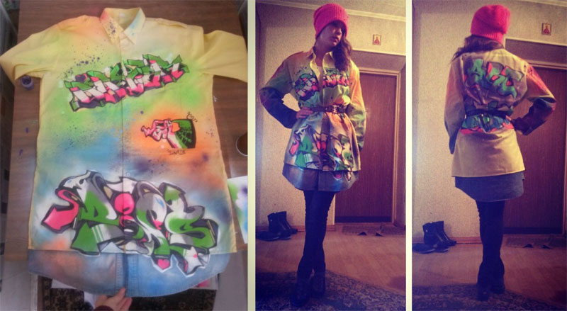 Пожалуй, уличное искусство граффити можно тоже приравнять к одному из направлений молодежных субкультур. Мы хотели показать, что такое самовыражение возможно не только на стенах, стеклах и проч. Почему бы не использовать ткань в качестве холста? Ведь именно это подразумевает профессия дизайнера: поиск неординарных решений, исходя из совершенно привычных вещей. Конечно, граффити не назовешь делом обычным, - но и одежда у нас выходит весьма интересной.
