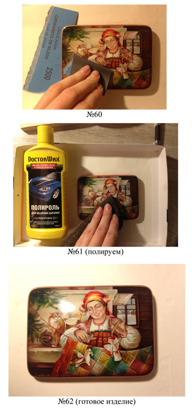 После просушки изделие покрывается лаком, сушиться (сутки-двое) и шлифуется до матового состояния.