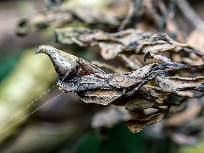Следующий номер – кузнечик Eulophophyllum kirki, найденный в Малайзии, на острове Борнео. Исследователи из Зоологического музея Александра Кенига в Бонне и лондонского Музея естественной истории, искавшие на Борнео змей и пауков, вдруг наткнулись на существо, очень похожее на лист – но не на сухой и мертвый, как в случае с пауком-шляпой, а на ярко-розовый и живой. Впрочем, ярко-розовой окраской у E. kirki обладают только самки, самцы у них обычного «кузнечикового» зеленого цвета.