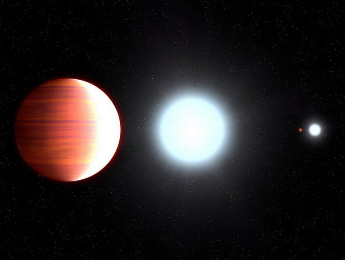 Один из таких юпитеров под названием Kepler-13Ab принадлежит к системе Кеплер-13А, которая находится на расстоянии около 1730 световых лет от Земли. На иллюстрации показано, как он вращается вокруг своего солнца, кроме него также изображены бинарный компаньон Кеплер-13В и оранжевая карликовая звезда Кеплер-13С, которые тоже входят в состав этой многозвёздной системы.