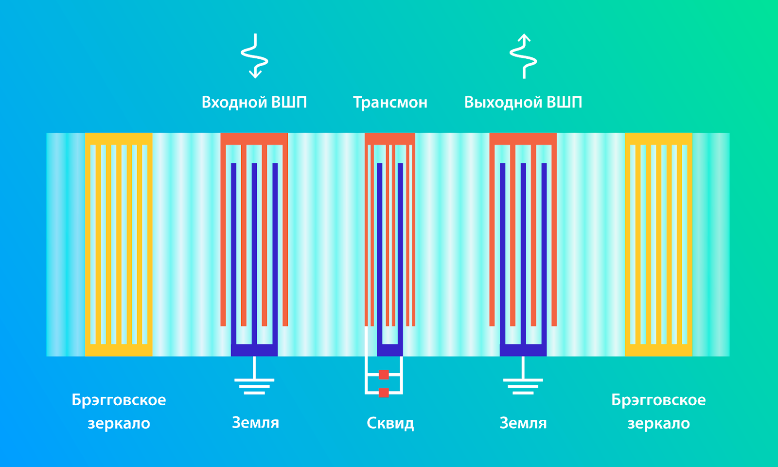 Пьезоэлектрик — материал, преобразующий электромагнитное воздействие в механическое и наоборот. Источник порождает на пьезоэлектрике поверхностную акустическую волну, которая бежит между зеркалами резонатора, отражаясь от них. Резонатор поддерживает и усиливает волны определенных длин. Внутри резонатора находится трансмон с двумя энергетическими уровнями. Между этими уровнями может происходить переход, то есть трансмон ведёт себя как искусственный атом.