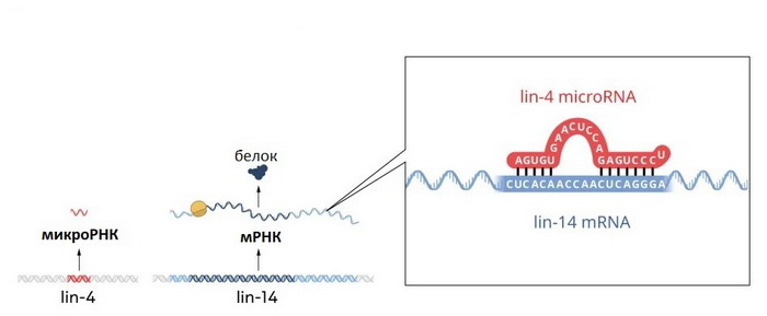 Однако Виктор Эмброс вместе с коллегами обнаружил, что на lin-4 синтезируется очень короткая РНК, которая никакой белковой информации не несёт. А Гэри Равкан выяснил, что lin-4 никак не влияет на количество матричной РНК, которая сходит с lin-14. То есть ген lin-4 подавляет ген lin-14 где угодно, только не на стадии транскрипции. В итоге оказалось, что это короткая РНК lin-4 связывается с длинной матричной РНК lin-14 и тем самым не даёт синтезироваться белку, который в РНК lin-14 закодирован. В 1993 году в двух статьях в Cell был описан новый механизм регуляции генетической активности с помощью микрорегуляторной РНК (микроРНК) lin-4 – механизм посттранскрипционный, потому что он имеет место после стадии транскрипции (и при этом блокирует стадию трансляции).