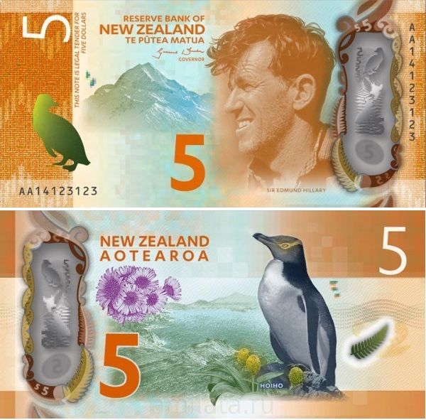Новые пять новозеландских долларов напечатал Canadian Bank Note Company – по дизайну Резервного банка Новой Зеландии. Банкнота выполнена в оранжево-коричневой цветовой гамме, на одной ее стороне изображен пингвин, на другой – сэр Эдмунд Хиллари.