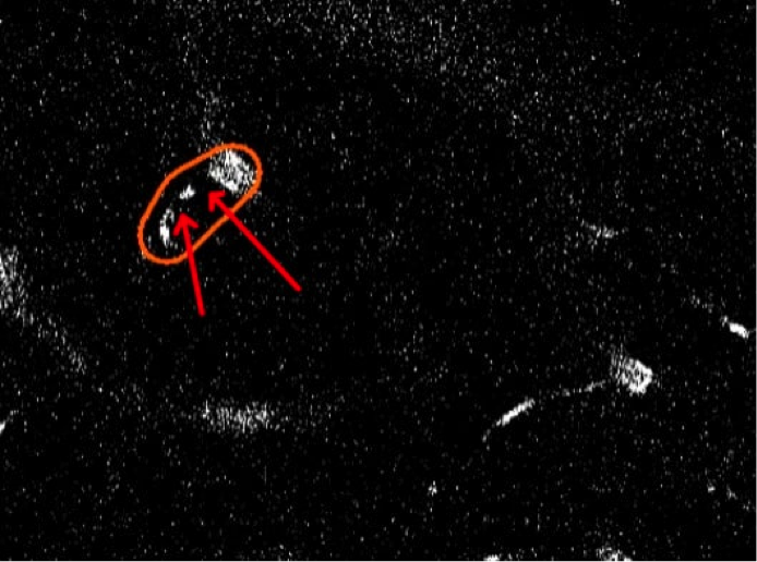 Игрок работает только с областью, обведённой оранжевой линией. Он запускает видео и внимательно следит за этим участком, пытаясь найти «закупорки» (“stalls”) — тёмные неподвижные точки внутри сосудов. Как например, здесь: