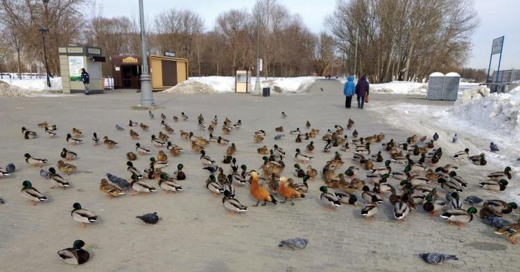 Птицы на подкормке у пристани «Коломенское», Москва. Фото А. Резанова.