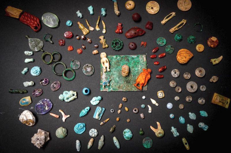 В соседнем помещении археологи нашли россыпь, как показалось на первый взгляд, украшений. Все предметы хранились в деревянной шкатулке, от которой в окаменевшем пепле остался след и бронзовые петли. При более пристальном рассмотрении находок стало понятно, что большинство их них не украшения, а талисманы и амулеты, сулившие удачу и счастье, защищавшие от сглаза и неудач.