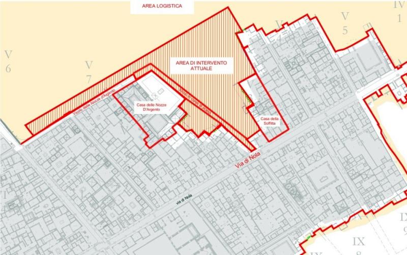 Параллельно в Помпеях усугублялась опасность обрушений и оползней. Дело в том, что над нераскопанными кварталами за почти два тысячелетия образовался толстый слой почвы. Во время раскопок при королях династии Бурбонов он ещё больше увеличился за счёт поднятого грунта, который долгое время не вывозили за территорию Помпей, а пересыпали на уже исследованные участки. В периоды сильных дождей насыпанный сверху грунт вместе с потоками воды устремлялся вниз, унося с собой и фрагменты древних стен (эту опасность в Помпеях называют «гидрологическим риском»). Поэтому в 2018 году археологами было принято решение доисследовать участок в V районе, обеспечить стабилизацию грунтов, реконструировать фасады домов вдоль переулка Серебряной свадьбы и расчистить переулок между Вторым и Третьим кварталами для удобного и безопасного передвижения туристов.