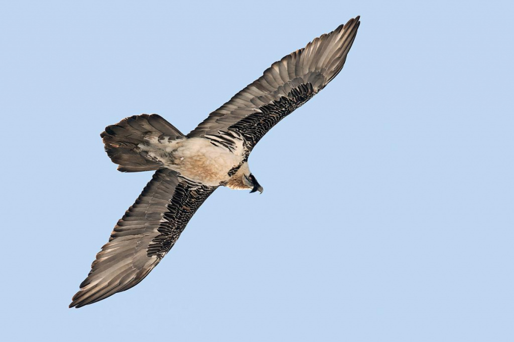 «Бородача мы встретили во время проверки фотоловушек на горном хребте у реки Большие Уры. Была ясная погода, около 25 градусов мороза, мы устанавливали фоторегистратор на маркировочной точке снежного барса и увидели, как над нами пролетела пара птиц. Вид птиц мы определили сразу, так как прошлой зимой видели в бинокль одну парящую особь бородача-ягнятника. Птицы заинтересовались нами и 2-3 минуты парили рядом на расстоянии около 50 метров, делая круги. За это время я успел достать из внутреннего кармана батарейку фотоаппарата, которую приходится держать в тепле из-за мороза, и сделать серию снимков. Потеряв к нам интерес, птицы полетели дальше вдоль склона горы», – рассказывает о встрече с редкими птицами Роман Афанасьев.