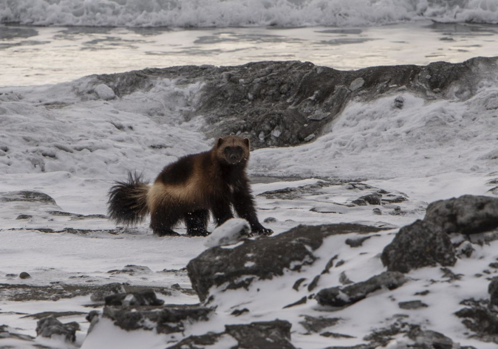 Камчатская росомаха (Gulo gulo kamtschaticus) – хищное млекопитающее из семейства куньих, представитель рода Gulo, что в переводе с латинского означает «обжора». Стихия зверя – северная лесотундра, горы и холмы и, как мы видим, морское побережье, которое на Камчатке окаймлено скалами и сопками.